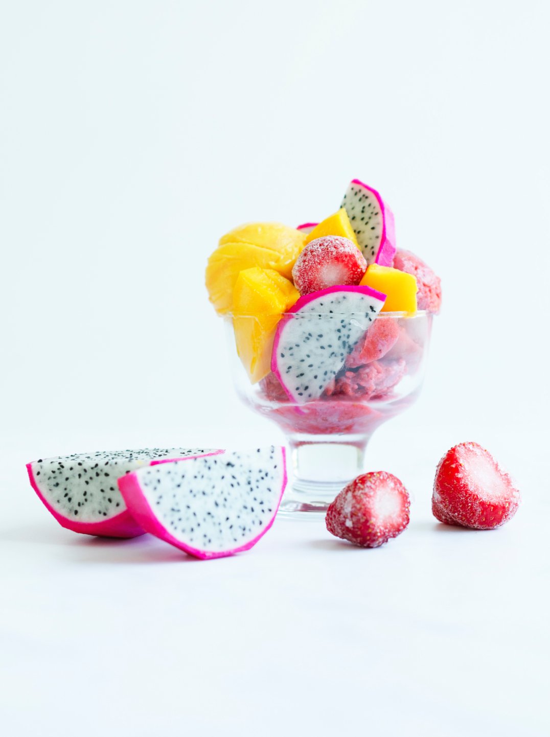 - Load the frozen mango, frozen dragon fruit, and frozen strawberry.