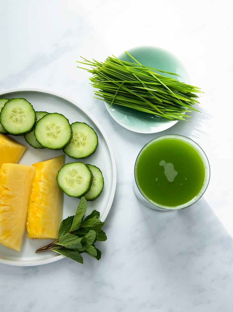 A detoxifying and cleansing juice. The grassy flavor of wheatgrass gets masked with the sweet pineapple and refreshing mint.