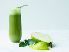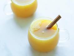 - Add the pomegranate, orange, limes, cucumber, and ginger to the juicer and juice.