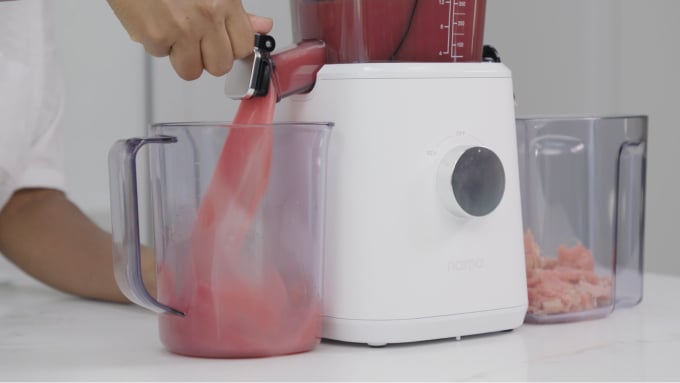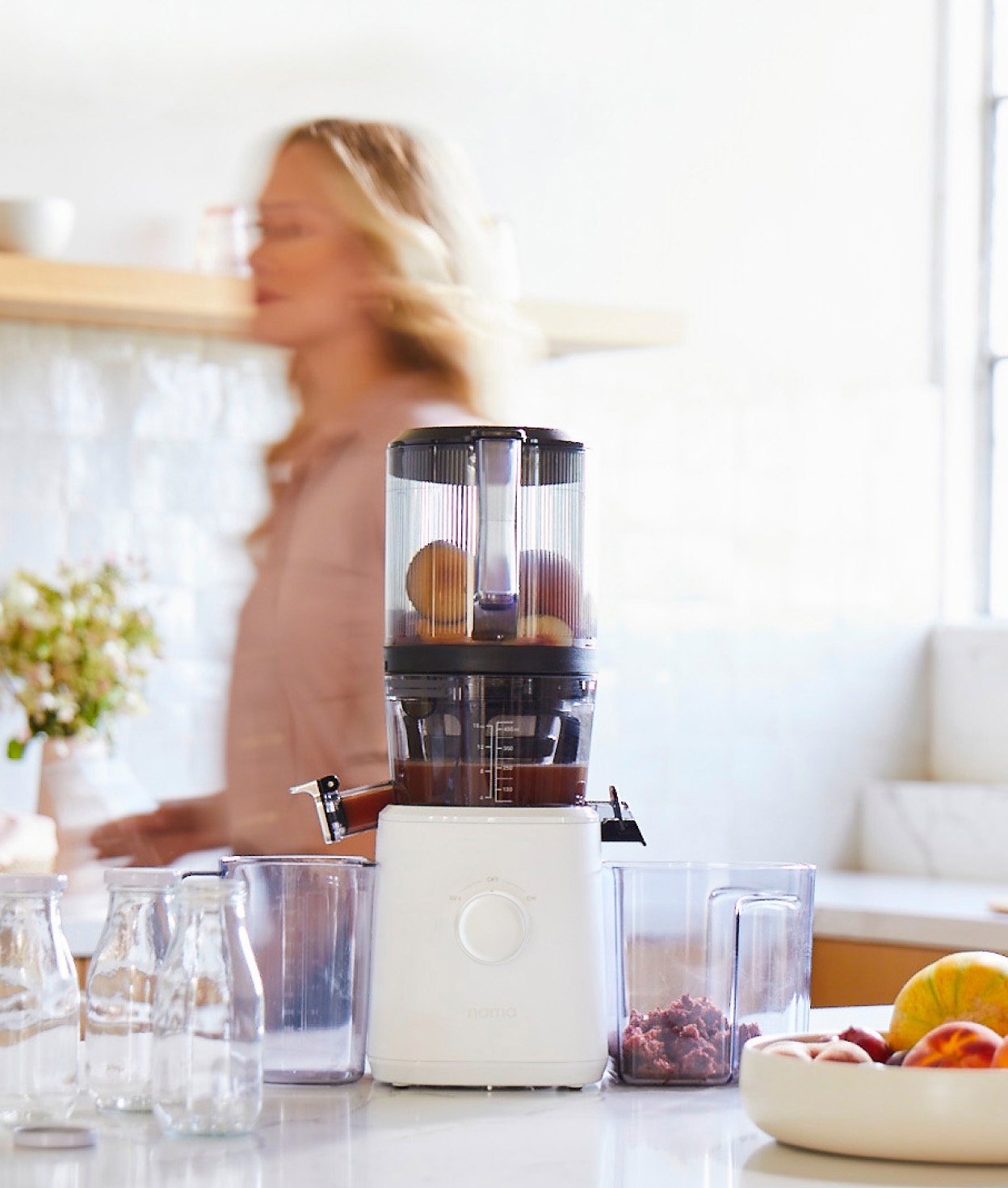 Seamlessly interchange the juicing chamber and blender jug on a single base