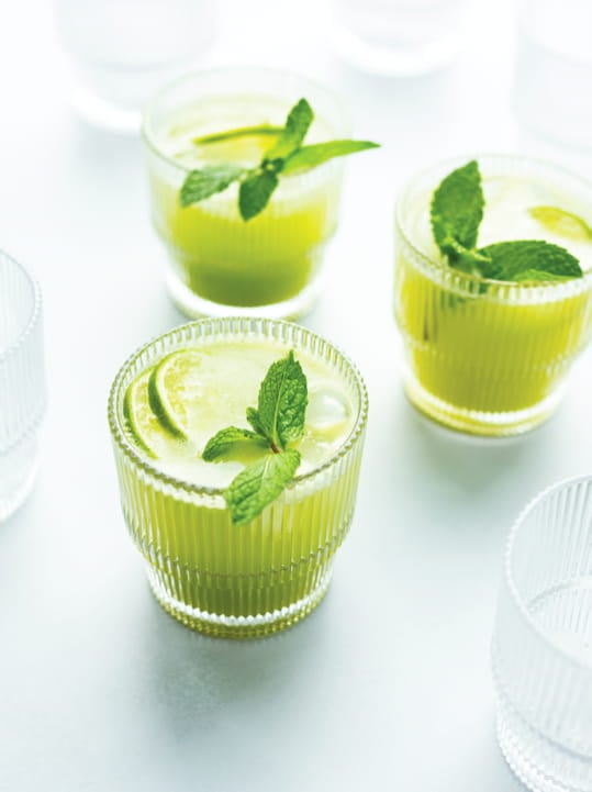 - Juice the mint, cucumbers, pineapple, and limes. Skim off excess foam.