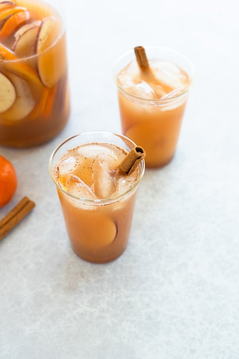 - Whisk apple juice and ground spices together in a large pitcher or punch bowl, then add orange and apple slices.